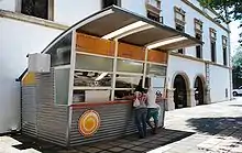 Some vendors operate out of food trucks and food carts, which offer a low overhead for entrepreneurs and often serve a huge variety of cuisines. Like restaurants, they are regulated and subject to inspections by local municipal or county health departments. Food trucks surged in popularity after the success of the Korean–Mexican fusion truck Kogi Korean BBQ in Los Angeles in 2009.[40][41] According to Smithsonian Magazine, the hip new generation of food trucks "are the new incubators of culinary innovation,"[41] with Kogi serving novel concoctions such as kimchi quesadillas, and gourmet ice cream truck Coolhaus serving inventive flavors such as Avocado Sriracha, Brown Butter Candied Bacon, and Fried Chicken & Waffles.[42][43]