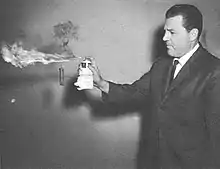 In 2018, the U.S. Consumer Product Safety Commission issued guidance on the safe operation of flamethrowers, with guidance creator Joseph Galbo acknowledging "While CPSC had received no reports of flamethrower injuries, it seemed prudent to put out safety tips for the public." following the introduction of more powerful civilian flamethrowers that year.[4] In the same year, The Boring Company introduced a "flamethrower" that was a blow torch shaped to look like a gun, and therefore it is legal to use in all U.S. states except Maryland.[5] The sale attracted criticism, with politician Miguel Santiago seeking to introduce legislation that would ban sales of the device in California.[6]