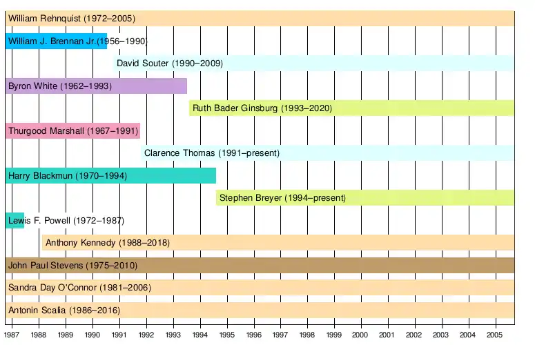Powell retired in 1987; President Reagan's nomination of Robert Bork was defeated by the Senate, and his second nominee, Douglas Ginsburg, withdrew before a vote. Reagan's third nominee, Anthony Kennedy, was confirmed by the Senate. Brennan retired in 1990 and Marshall in 1991, giving President George H.W. Bush the opportunity to appoint Justices David Souter and Clarence Thomas. White retired in 1993 and Blackmun retired in 1994, and President Bill Clinton appointed Justices Ruth Bader Ginsburg and Stephen Breyer to replace White and Blackmun respectively.