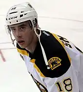 In July 2013, Smith was included in a blockbuster trade between Dallas and the Boston Bruins, which sent him, Loui Eriksson, Joe Morrow and Matt Fraser to Boston in exchange for Tyler Seguin, Rich Peverley and Ryan Button.[23] During the pre-season, Smith was placed on the Bruins' third line with Chris Kelly and Carl Söderberg.[24] However, as a result of injuries, Smith was moved up to a line with Patrice Bergeron and Loui Eriksson.[25] He finished the regular season with 19 goals and 30 assists which included 17 goals and 17 assists throughout November. As a result of his success, the New England Sports Network (NESN) TV network named Smith the 45th annual "7th Player." The "7th Player" is awarded to the Boston Bruin who most exceeded all expectations that season, as voted by the team's fans.[26]
