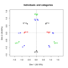 The idea of representing the qualitative variables themselves by a point (and not the categories) is due to Brigitte Escofier.[3] The graphic as it is used now has been introduced by Brigitte Escofier and Jérôme Pagès in the framework of multiple factor analysis[4]