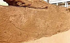 Inscribed on a large block of sandstone (2,75m x 0,80m), it is an early example of low relief carving, possibly describing a war between the Egyptians and the A-Group Nubian people.[1] It describes the victory of an Egyptian king, embodied by his serekh, although the serekh does not give a specific royal name.[1] The circles at the bottom represent cities. The boat is considered as an embodiment of the king, dominating defeated Nubians.[1]