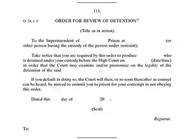 The unlawful detention of a person is a breach of his or her right to personal liberty guaranteed by Article 9(1) of the Constitution. An order for review of detention (formerly known as habeas corpus) can be sought to direct the party responsible for detaining the person to produce the detainee before the High Court so that the legality of the detention can be established. In Re Onkar Shrian (1969),[27] the High Court held:[28]