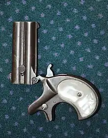 The Remington Double Derringer was made from 1866 to 1935. Production prior to 1869 had no extractors.[2] The first 100 Double Derringers have "Manufactured by E. REMINGTON & SONS, ILION, N.Y." stamped on the right side of the barrel and "ELLIOT'S PATENT DEC. 12, 1865" stamped on the left side of the barrel. (This refers to firearms inventor William H. Elliot's U.S. Patent 51,440, "Improvement in Many-Barreled Fire-Arms", which describes the key features of the original design in some detail.[3]) After the first 100, the "manufactured by" was no longer stamped between the barrels. There are a few DDs with the marking, "Remington's Ilion NY USA" but there is no known reason for this marking. About serial 1600, an extractor was installed on the left side, between the barrels. After about serial 2400, the marking was put on the top of the barrels in two lines. "E. REMINGTON & SONS, ILION, N.Y.; ELLIOT'S PATENT DEC. 12th 1865." This is the Second Model, and is called the "Two Line," by collectors. The barrel rib top inscription changed to "REMINGTON ARMS CO. ILION N.Y." in 1888, this is the Third Model. In 1911 the marking was changed to, "REMINGTON ARMS - U.M.C. CO. ILION, N.Y." In 1921, Remington adapted a number system for every model. At this time the Double Derringer became the Model 95.