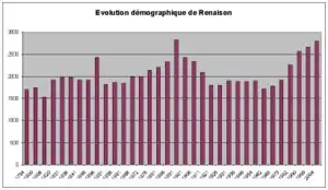 A second dam, the rockfill Le Rouchain dam was built between 1970 and 1975. In 1976, a kindergarten was built, followed closely by a college in 1978. It will be extended in 1983 and 2006. A second match was signed in 1992 with Pagouda (Togo). On 14 February 1994, the entire vineyard Coast roannaise gets the designation of origin (AOC). In 1998, the town hall is enlarged and the work of redevelopment begins. In 2003, Renaison enters the Community of communes from West Roannais (CCOR).