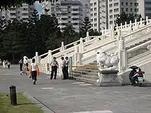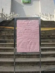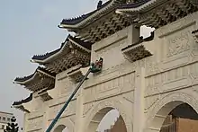 On December 7, the old inscriptions on the main gate were removed.[28] Contracted workers took more than seven hours to separate the four characters, each weighing half a ton, and lower them down carefully one by one. The final character, zheng (正), was peeled off at 5:26 p.m.[29] A TV cameraman was run over by a small truck and seriously injured as supporters and opponents of the government's decision to alter the plaque at the memorial hall clashed near the scene.[30] The Taipei City Government issued another NT$1 million fine to the MOE for damaging a historical site. The MOE defended its move and denied any other plans to modify the site, such as removing the statue of Chiang Kai-shek or demolishing the walls surrounding the park.[31]