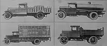 At the end of 1930, Renault ended production of its last "coalscuttle"-bonneted (with the radiator behind the engine) commercial vehicles, adopting more vertical grilles and, in some models, vertical slits on both sides of the engine compartment, as the radiator was moved ahead.[1] At the same time, it was introducing its first diesel engines for road transport. These engines were a 7-litre inline-four and a 10.5-litre inline-six, both with direct injection.[2][3][4] The inline-four was initially used on Renault's heavy trucks from 1930,[3] and the inline-six was introduced in 1931.[2] The engines had been extensively tested for two years and its development had as base Renault's experience on diesel marine engines, which allowed the company to create its own diesel engine technology instead of purchasing it to foreign manufacturers, as most of its French competitors did. The production of Renault's commercial range at the time was heavily modularised,[4] with many standardised pieces,[4][5] improving economies of scale, quality on mass production and also simplifying parts replacement.[4]   The light and mid-range commercial vehicles for 1931 were largely made up from evolutions of existing models: the RY and KZ (both with payloads under 1 tonne), the OS (1.3-1.8 tonne payload), the PR (2 tonnes payload), the SX (2 tonnes payload), and the SZ (3 tonnes payload).[1] The upper ranges had a mix of new and updated but old models, including the TL (4 tonnes payload), TR (5.5 tonnes payload), TS (7.5 tonnes payload), TI, and two tractor units (SY and TT).[4][6]