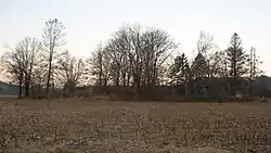 The central part of the district is the Rennert Mound (also known as the "Minnie Rennert Mound"),[2] which retains its original shape despite digging by locals in the past. Because the mound has never been excavated professionally, no significant artifacts have been recovered from it; consequently, the culture of the builders is unknown.[3] The surrounding field has yielded plentiful lithic cores of white and tan chert, but too few cores have been found to justify classification of the fields as a village site.[4]: 120 Due to its location and shape, the mound is believed to have been built by Adenan or Hopewellian peoples, both of which typically buried many bodies and large numbers of grave goods within mounds of this size.[3] Another mound was once located approximately 90 feet (27 m) to the west, but it has been destroyed. The preservation of the one mound despite the destruction of the other is likely due to recent intervention: in the early twentieth century, landowner John Rennert planted trees all around this mound to preserve it, but he made no such efforts around the other mounds.[4]: 120