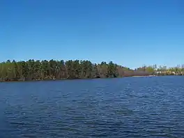 The western section of the lake has two forks fed by inlet streams; the northern fork by groundwater, and the southern fork by a 1,150-foot (350 m) stream created by two drainage culverts and groundwater seepage. The two forks merge 2,300 feet (700 m) past the southern inlet stream.[8] The lake has a surface area of 35.3 acres (14.3 ha). It has a mean depth of 11 feet (3.4 m) with a maximum depth of over 20 feet (6.1 m).[10]