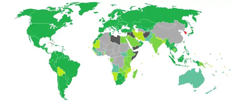 Visa requirements for South Korean citizens are administrative entry restrictions by the authorities of other states placed on citizens of Republic of Korea. As of 15 January 2019, South Korean citizens had visa-free or visa on arrival access to 189 countries and territories, ranking the South Korean passport second in the world in terms of travel freedom (tied with the Singaporean passport, and one ranking down from the Japanese passport) according to the Henley Passport Index.[21] Additionally, Arton Capital's Passport Index currently rank the South Korean passport third in the world in terms of travel freedom, with a visa-free score of 165 (tied with Danish, Dutch, French, Finnish, Italian, Luxembourgish, Norwegian, Singaporean, Spanish, Swedish and United States passports), as of 15 January 2019.[22]