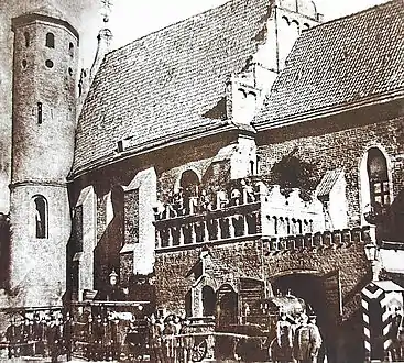 In addition to the Volunteer Brigade, a professional Fire Brigade was created established in 1872, having its headquarters in Poor Clares' Church which had been secularized. To fit fire activity, a gate was created on the wall of the ex-church giving onto Jagiellońska street: doing so allowed horse carts to enter and exit. Likewise, stables and forage storage were located in an adjoining building (now located at the place of Drukarnia shopping mall). The Chief fireman officer, known as Brandmeister, received a professional training in Berlin.[1]
