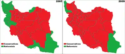 BBC Iranian affairs analyst Sadeq Saba found abnormalities in the way results were announced. Instead of results by province, the "results came in blocks of millions of votes," with very little difference between the blocks in the percentages going to each candidate. This suggested that Mahmoud Ahmadinejad did equally well in rural and urban areas, while his three opponents did equally badly in their home regions and provinces as in the rest of the country. This contradicted "all precedent in Iranian politics", where Ahmadinejad had been very popular in rural areas and unpopular in the big cities, where ethnic minorities had favored anti-establishment candidates, and where candidates had tended to carry their home provinces.[12] Another anomaly, according to British-based researcher Ali Alizadeh, is that a large turnout did not favor the opposition, since in elections, both in Iran and abroad, "those who usually don’t vote, i.e. the silent majority, only come out when they want to change the status quo."[13] Historically, low turnout has always favored conservatives in Iranian elections, while high turnout favors reformers. That's because Iran's most reliable voters are those who believe in the system; those who are critical tend to be reluctant to participate.[14] According to modern Middle Eastern and South Asian historian Juan Cole, there were several anomalies in the election results. Official reports gave Ahmadinejad 50% of the vote in the city of Tabriz despite the fact that this was the capital of Mousavi's home province, Eastern Azerbaijan, where Mousavi's rallies were well attended and which has traditionally given good turnouts for even "minor presidential candidates" who came from the province. Ahmadinejad also won Tehran by over 50%, even though his popularity in larger cities is considered to be low. Meanwhile, Karroubi, who received 17 percent in the first round of the 2005 presidential elections, got less than one percent of the vote this time,[15] and lost even his own province of birth, despite the tendency for Iranian voting to follow ethnic lines.[16] A survey of votes by a London-based think tank Chatham House found that in a third of all provinces, the official results would require that Ahmadinejad had received "not only all former conservative voters, all former centrist voters and all new voters but also up to 44 percent of former reformist voters -- despite a decade of conflict between these two groups.".[17][18]