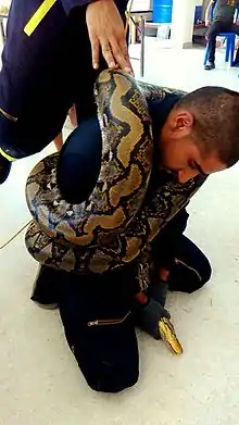 - In January 2009, a 3-year-old boy was wrapped in the coils of a 18 ft (5.5 m) pet reticulated python, turning blue. The boy's mother, who had been petsitting the python on behalf of a friend, rescued the toddler by gashing the python with a knife. The snake was later euthanized because of its wounds.[44]