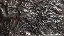 Reticulation exploits the difference between the melting temperature of an unalloyed metal and that of an alloy of the metal; by depleting the base metal content in the surface layer, a piece can be heated in such a manner so as to render the interior of the piece molten while leaving the surface of the piece intact. The reticulated surface is formed by the thermal expansion and contraction of the interior metal which is effected by deliberate variation in the application of localised heat.[2][3]