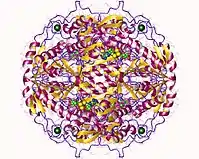 Retinal dehydrogenase is a tetramer of identical units, consisting of a dimer of dimers.[1] Retinal dehydrogenase monomers are composed of three domains: a nucleotide-binding domain, a tetramerization domain, and a catalytic domain. The dimer can be pictured as an "X" with the dimers forming upper and lower halves that cross over each other. Interestingly, the nucleotide-binding domain of retinal dehydrogenase contains 5 instead of the usual 6 β-strands in the Rossman fold.[2] This appears to be conserved across many aldehyde dehydrogenases. The tetramerization domains lie equatorially along the "X" and the nucleotide binding regions appear on the tips of the "X". Nearby the tetramerization domain lies a 12 Å deep tunnel that gives the substrate access to the key catalytic regions.[1] Residues near the C-terminal end of the catalytic domain have been found to impart specificity in other aldehyde dehydrogenases. Common to many aldehyde dehydrogenases is a catalytic cysteine, which was found to be present in RALDH2, a specific retinal dehydrogenase for which the structure has been solved.[1][3][4]