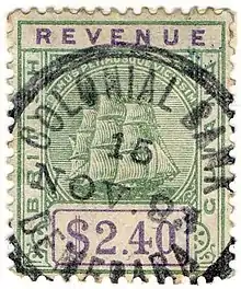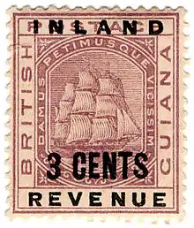 In 1888–1889, special printings of British Guiana postage stamps depicting the colonial badge (a sailing ship) were overprinted INLAND REVENUE and with face values ranging between 1c and $5. These stamps were printed by De La Rue, and some were later surcharged locally in 1889 and 1890.[1] Despite their inscription, these stamps were also valid for postal purposes so they are regarded as postal fiscal stamps.[2]