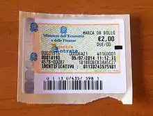 The Italian revenue stamp, referred to as a "marca da bollo" in Italian, is a revenue stamp that has been used in Italy beginning in 1863 as payment for the validation of acts and public documents (for example, notarial acts, statements, passports, etc.).
