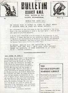 In 1972, they joined with a loose grouping in Belfast to form the Revolutionary Marxist Group, mainly under the influence of D.R. O'Connor Lysaght (known as Rayner Lysaght)[2] and Anne Speed, Brendan Kelly, Betty Purcell. In 1974, the organisation affiliated to the USFI.[3] The RMG campaigned against internment in Northern Ireland and took part in several public protests against it.[4]