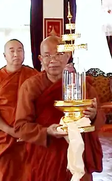 ![]() Dr. Rewata Dhamma carrying the United Nations Buddha relics during their display at Dhammatalaka Pagoda in July 2003 | |
