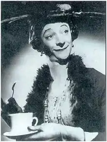 He made his first appearance on BBC radio, as Mrs Shufflewick, in 1950, and soon became popular, appearing regularly on such programmes as Variety Bandbox and Midday Music-Hall.[7] He continued to perform in clubs, using more risqué material than on the radio, and became a mentor to the young Danny La Rue.[1] In the theatre he appeared in variety and summer shows, including summer seasons in Blackpool, and was a popular pantomime dame.[2] He also appeared on television, and in 1955 was one of the first performers to be voted as "TV Personality of the Year".[5] However, he became increasingly addicted to alcohol and gambling, and in 1962 was declared bankrupt.[4]