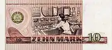 The engraving on the reverse of the 1971 series East German 10 Mark banknote shows a female engineer at the control console of the Rheinsberg plant. The obverse features women's rights advocate Clara Zetkin.