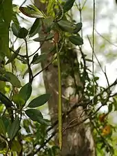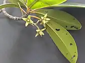 Members of the genus Rhizophora are very similar to each other in morphology. They grow up to 30 m (100 ft) tall often with aerial stilt roots, but in more marginal habitats are shorter, more branched and scrubby. The leaves grow in opposite pairs, each pair with two interlocking stipules. The leaves are simple and entire, with elliptical hairless blades and slightly down-rolled margins. The lower surfaces have numerous tiny corky warts which appear as black spots on dried leaves.[2]
