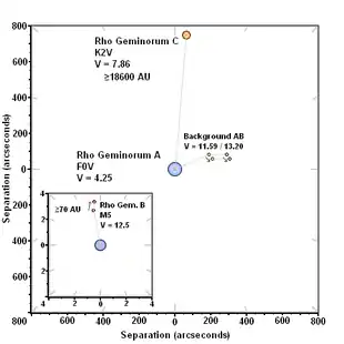 The next-closest companion, the magnitude 11.59 WDS 07291+3147 C, had a much larger separation of 211.6 arcseconds in 1886. However, this separation increased by 10 arcseconds by 2001, indicating that it is a background star that is unrelated to Rho Geminorum. Correcting for Rho Geminorum A's proper motion, this star's proper motion is RA = -19 mas/yr and Dec = -55 mas/yr. This is a modestly large value, consistent with a distance of a few hundred light-years. WDS 07291+3147 C is itself listed as having a companion, the magnitude 13.20 WDS 07291+3147 D. Relative to WDS 07291+3147 C its separation has remained at about 100 arcseconds between 1909 and 2001, indicating similar proper motion. While this would indicate that the two stars are bound, at a large distance this separation would indicate a separation of at least several thousand AU and their mutual separation has not been entirely consistent (the position angle has increased from 267 to 270°, and the separation has decreased from 104.1 to 102.3 arcseconds). It is therefore possible that the two background stars are bound, but it is not certain.
