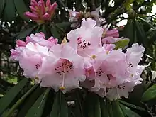 Rhododendron calophytum, the beautiful-face rhododendron,[1] is a species of flowering plant in the heath family Ericaceae that is native to the forests of central and eastern China, where it lives at altitudes of 1,400–4,000 m (4,600–13,100 ft).[2] Growing to 12 m (39 ft) tall and 8 m (26 ft) broad, it is a substantial evergreen shrub. The leathery leaves are narrow and up to 30 cm (12 in) long. In early Spring trusses of bell-shaped, white or pale pink flowers, spotted with maroon inside, are produced.[3]
