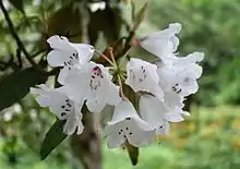 Rhododendron galactinum (乳黄叶杜鹃) is a species of flowering plant in the family Ericaceae.[1] It is native to western Sichuan in China, where it grows at altitudes of 2,900–3,500 m (9,500–11,500 ft). It is a hardy evergreen tree[2] that grows to 5–8 m (16–26 ft) in height, with leathery leaves that are oblong-elliptic, oblong-obovate or broadly lanceolate, 11–22 by 5–7 cm in size. The flowers are white to pale pink with a crimson basal blotch.