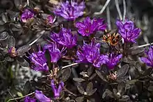 Rhododendron lapponicum (高山杜鹃), the Lapland rosebay,[1] is a dwarf rhododendron species found in subarctic regions of North America, Europe and Asia, where it grows at altitudes ranging from sea level to 1,900 m (6,200 ft). It is an evergreen prostrate shrub growing to 20–45 cm (7.9–17.7 in) in height, with leaves that are oblong-elliptic or ovate-elliptic to oblong-obovate, 0.4–1.5 by 0.2–0.5 cm in size. The flowers are reddish or purple.