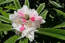 Rhododendron thayerianum (反边杜鹃) is a rhododendron species native to western Sichuan in China, where it grows at altitudes of 2,600–3,000 m (8,500–9,800 ft). It is an evergreen shrub that grows to 3–4 m (9.8–13.1 ft) in height, with leathery leaves that are narrowly oblanceolate, and 9–17 × 1.5–2.5 cm in size. The flowers are white, sometimes deeply flushed pink on the outside along the petal ridges, or pink. It flowers quite late in the season, in June and July.[1]