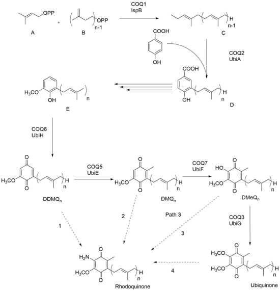 In the case of the prokaryotic organism R. rubrum, RQ has been shown to be synthesized by addition of an amino group to a pre-existing UQ; thus UQ needs to be present as a precursor before RQ can be made. Figure 1 shows the biosynthesis of UQ in yeast and E. coli where ‘n’ represents the number of isoprene units between various organisms. Dimethylallyl diphosphate A and isopentyl diphosphate B come together to form polyisoprenyl diphosphate C. With the addition of p-hydroxybenzoic acid, the product that arises is 3-polyprenyl-4-hydroxybenzoic acid D. The next three steps of synthesis varies between different organisms, but molecule E is made across all organisms and through oxidation, demethyldemethoxyubiquinone (DDMQ) is eventually formed. RQ has been theorized to be synthesized from DDMQn, DMQn, DMeQn, or UQn, as shown with the dashed arrows. Recent studies have shown that Path 4 - RQ biosynthesis via UQ, is the favored route.[4] It has been further shown that the gene rquA is required for the biosynthesis of RQ in R. rubrum, and that RquA catalyzes the conversion of UQ to RQ.[5][6]