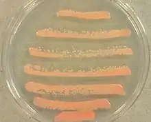 It normally grows at 37 °C at a rapid rate, and requires a minimum water activity of 0.92, pH of 2.2, and organic acids or HCl.[2][3] Growth is inhibited by 100 mg/kg or less of benzoic acid or sorbic acid and a pH of 4 or above.[3] The fungus is unable to grow on malt acetic agar or MY50G medium.[3] At maturity, the cells reach a diameter of 3-5 µm and are round, oval, or elongate in shape, aggregating as mucoid colonies.[2][4] Carbohydrates in the cell include glucose, fucose, galactose, and mannose.[1] R. glutinis is heat resistant, an uncommon feature in yeasts without spores, tolerating 62.5 °C (144.5 °F) for 10 minutes.[3] R. glutinis is closely related to Rhodotorula mucilaginosa, differing only in their ability to use nitrate as a nitrogen source, which R. glutinis cannot assimilate.[3] Both species are incapable of fermentation and assimilation of Myo-Inositol and D-glucoronate.[1][5][4]