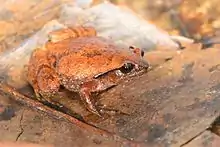 The advertisement call is a series of honking notes, each around 505 ms in duration, with roughly two-second delays between calls. The call's dominant frequency is around 1272 Hz. The calls lack pulses. These calls are higher in frequency than the similar Rhombophryne alluaudi.[2] It probably has nidicolous non-feeding tadpoles and exhibits some degree of parental care, but this has not been observed.[2] Other mating habits such as amplexus, clutch size and deposition site, and developmental duration are unknown.[2]