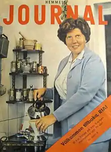 In 1956, the year when Swedish television was officially launched, Ria Wägner started working as a television host, for her own show "Hemma med Ria" (At home with Ria). The programme was broadcast from 1956 to 1966, and again from 1970 to 1978, and it focused on cooking, home economics, art, and music. Each programme ended with Wägner making her signature backwards wave at the camera.[2][4]