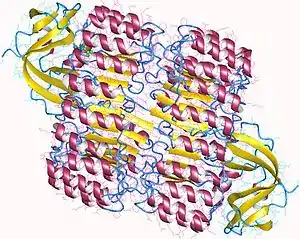 ![]() Top view of porcine ribonuclease inhibitor, showing its horseshoe shape.[1] The outer layer is composed of α-helices and the inner layer of parallel β-strands. The inner and outer diameters are roughly 2.1 nm and 6.7 nm, respectively. | |||||||||||