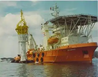 The MS Wildrake was a diving support vessel constructed for and owned by Anders Wilhelmsen AS, a Norwegian shipping company. It had a built-in saturation diving system designed and built by another Norwegian company, Møllerodden AS.[9] In May 1979, Infabco began negotiations for exclusive rights to the Wildrake.[10] In June and early July, with the Wildrake moored near Ulsteinvik, Infabco personnel prepared its diving system for use. The system was certified by Det Norske Veritas (DNV) on 3 July 1979.[11] In mid-July, 17 bell runs were conducted from the Wildrake to prepare the SALM base for the reattachment.[12]