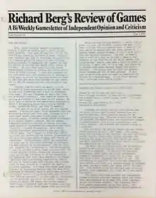 Richard Berg's Review of Games was a short, frequent, professionally produced fanzine dedicated to reviews.[1] In 1980, Richard Berg, then working as a game designer for (SPI), started writing and editing reviews of wargames, which SPI published as Richard Berg's Review of Games. It began as a two-page standalone newsletter, published twice a month for 25 issues.[2] SPI then converted it into a regular feature in the pages of SPI's Strategy & Tactics until late 1985.[3]