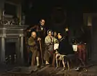 Best known for detailed depictions of contemporary interior scenes, Woodville chose subject matter that was often ambiguous. In 1846, he sent The Card Players back to the United States to be exhibited. The Card Players was a great success for the artist. Politics in an Oyster House was commissioned in 1848 by Baltimore patron John H. B. Latrobe.[1] Like other Woodville paintings, it was reproduced as a popular print. Widely acclaimed by American critics, this painting deals with the "low life" environment of oyster cellars and marginal characters that frequented them. Woodville's great attention to detail is very apparent in this painting. In one of his most popular paintings, Old ’76 and Young ’48 (1849), Woodville provides a glimpse into a tension-filled scene of generational differences between the old Revolutionary war veteran and the young wounded soldier home from the Mexican War. The interesting aspect of this painting is how Woodville continues to show the differences in these two generations through the objects located throughout this interior scene.