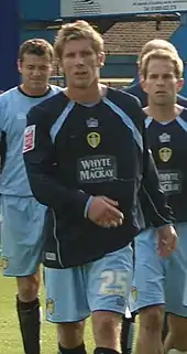 Cresswell was bought by Preston's Championship rivals Leeds United on a four-year contract on 24 August 2005 for a fee of £1.15 million, after rivals Sheffield United had a £1 million bid accepted.[40] After the signing was completed, manager Kevin Blackwell said "To get a player of Cresswell's quality is amazing", while Cresswell cited his desire to win promotion with Leeds.[40] He first found the net with two goals in Leeds' League Cup 2–0 away victory against Rotherham United on 20 September 2005.[41] However, Cresswell suffered knee ligament damage in a match against Derby County eight days later.[42] This injury kept Cresswell out of action for seven weeks, making his return in Leeds' 1–0 defeat away to Wolves on 17 December 2005, and scoring in his second match back against Coventry City in a 3–1 home win on 26 December.[41] Another knee injury picked up during a training session in February 2006 kept him out of the team until he entered Leeds' 1–1 draw with former club Preston in the Championship play-off semi-final first leg as a 78th-minute substitute on 5 May 2006.[41][43] However, he was sent off in the 2–0 win in the second leg, meaning he was suspended for the 2006 Championship play-off Final, which Leeds lost 3–0 to Watford at the Millennium Stadium.[41][44][45] He finished 2005–06 with 21 appearances and seven goals for Leeds.[41]