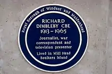 Frederick Richard Dimbleby, CBE (25 May 1913 – 22 December 1965) was an English journalist and broadcaster, who became the BBC's first war correspondent, and then its leading TV news commentator.