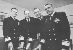 Colbert served as director of the naval command course for its first two classes. Students generally attended the regular Naval War College lectures for the naval warfare 1 course, and took field trips during lectures dealing with classified topics such as nuclear operations. Colbert leveraged his extensive personal contacts to arrange visits to military and naval sites, as well as industrial plants in Buffalo, New York, and the New York Stock Exchange.[10] Colbert and his wife also spent a considerable amount of their own money to organize social events to foster lasting informal ties between students, whose personal bonding was viewed as almost as important as the formal curriculum. Colbert was impressed by the high quality of the inaugural class, writing, "The capability of the students is far beyond our expectations—they really look like the 'future CNO's of the Free World' as Admiral Burke describes them."[2]