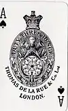 In England, during the 19th century, under the Stamp Act 1712 playing card manufacturers required a license, a duty legal stamp that incorporated the royal coat of arms of the United Kingdom to be placed on the ace of spades, known as the "duty card" or colloquially called the "duty ace" or "Old Frizzle"[5] and a regulated label appended to the wrapper of the pack of playing cards.[1][4][6] The brass duty legal stamps were kept at the office of the Stamp Commissioner and the stamped duty cards with the name of the card maker on them and the same number of labels were delivered to the card marker.[4] These laws and regulations were to enforce the excise duty tax levied on every pack of playing cards.[1][4] Card makers faced a monetary penalty for not following the laws under the Stamp Act.[1][4]