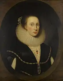 Their co-heiresses were the two daughters of his elder brother John. One of them, Christian, married Sir Peter Temple of Stowe.[6] A portrait of this Sir Richard Leveson seems to have found its way into the collection of paintings at Stowe House, Buckingham. A portrait of Sir Richard Leveson, said to be by van Dyck, belonged to the Duke of Sutherland in 1891.[7] This portrait was purchased for £65 02s 00d from the sale of the possessions of the Dukes of Buckingham and Chandos held at Stowe House in 1848. It was described in the sale catalogue as by Van Dyck (whereas other paintings are described as 'after Van Dyck' or a 'copy of Van Dyck'). The catalogue records that Sir Richard is shown ‘in a black dress, with a frill’ and that the painting was bought ‘after a very active competition.’[8]
