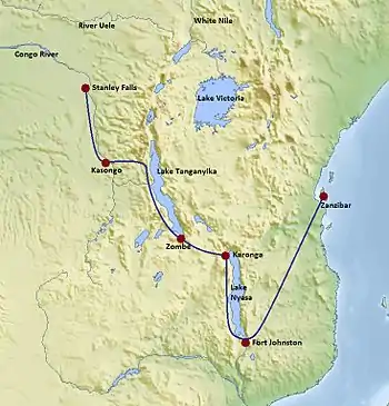 The overhead telegraph may have been intended as a link in the proposed line from the Cape to Cairo, it was to be supported by 7m-high poles at 150m spacings and had been allocated a budget of three million francs.[63][64] Mohun was allowed free rein to choose his own staff and set out with five electricians/engineers (including some from Britain and France), Dr. Raan Horace Castellote as medical officer and a military escort commanded by Belgian Captain Verhellen.[61][64][65][66] He advertised among the Askari of Zanzibar for volunteers to provide the escort required by the expedition, and received more than one thousand responses.[66] From these, he selected one hundred men to accompany him, twenty of whom had served with him in the Congo expedition of 1894.[66] The work was hoped to have been completed by 1900.[64]