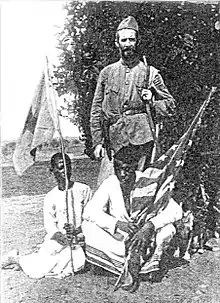 On March 29 the Chaltin Expedition reached a deep stream and, in searching for a fording place, came across a large group of Arab slavers. The expedition launched a surprise attack on the camp, supported by an artillery piece, and routed them after several hours fighting.[28] The expedition found only one dead body left on the field, though it was supposed that the Arabs had lost more men and carried the bodies away with them in retreat.[29] Mohun was with a force of 150 men sent over the stream to Riba Riba with the intention of reaching the town before the retreating slavers could give warning. Once again they encountered a deserted town, except for two hands nailed to a flagstaff taken from the corpses of two European men killed the week before.[28] Mohun's group burned the town to the ground before returning to the main party of the expedition.[29] The force suffered another outbreak of smallpox and it was decided to send the sick back to the steamer at Bene-Kamba. The main force rested for a number of days before following on. During the three-day march the expedition encountered the bodies of the sick that had died on the return journey and a roll call at Bene-Kamba revealed some 104 men had died in the first 2 weeks of the expedition.[28]