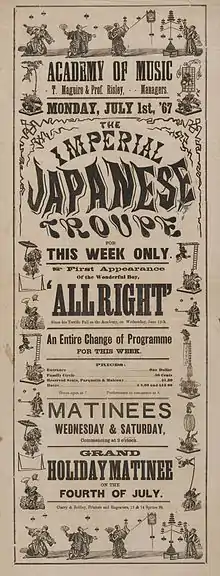 In 1856 Carlisle travelled to Australia, reportedly to prospect for gold, then on to New Zealand. In 1861 he was in Singapore. In 1864 he moved to Shanghai, again staging circus performances, before moving in the same year to Yokohama, Japan where he was recognized as the first Western professional acrobat in the country. As a serial entrepreneur Carlisle saw an opportunity to develop a dairy business in the recently opened treaty port; after importing a small herd of cows from San Francisco and ice from Harbin he sold milk and gained renown as the first seller of ice cream in Japan.[11] Carlisle returned to performing and stage management and moved back to the United States, bringing with him a troupe of traditional Japanese acrobats. The Imperial Japanese Troupe, as they were called, had their East Coast debut in Philadelphia and performed there for a month in 1867.[12] In April 1869 he and his company were the first to appear at the newly reopened Hippotheatron in New York.[13]