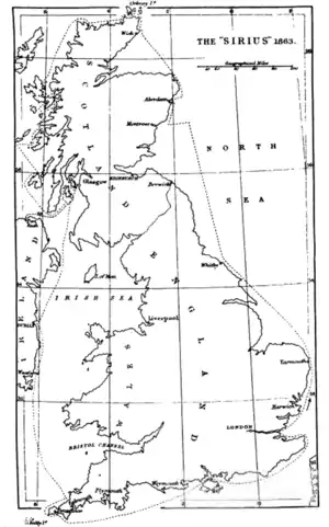In 1863 McMullen and two other crew sailed around the British Isles, first touching at Aberdeen after nine days open sailing from Greenhithe, Sirius then sailed over the north of Scotland through the Pentland Firth, down the Western Isles through the East Irish Sea, around Land's End and back to the Thames. A total track of 2,640 miles logged covered in 28 days. Whilst at the Island of Skye he describes his visit thus, "June 28th 1863, 9:15am. Sailed through Hoan Island Sound; 11pm rounded Cape Wrath. June 30th 10:30am anchored in Loch Staffin, Isle of Skye, and, with a boy of sixteen as a guide, ascended 1,500ft to the famous Rock of Quiraing, accompanied most of the way up and down by a crowd of good natured little urchins in tatters who could not speak a word of English."[12]