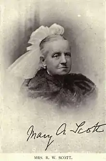 Richard William Scott was married in Philadelphia, Pa., November 8, 1853, to Mary Heron, the daughter of John Heron and Frances, his wife. She was born and educated in Dublin, Ireland. The couple had two sons William L. Scott, Local Master in Chancery, and D Arcy Scott, Barrister, Ottawa and four daughters. Before her marriage, Mrs. Scott was a professional singer who toured in Canada and the United States as a member of "The Heron sisters." The couple lived at 274 Daly Avenue, Ottawa. She served on the Executive Committee of the National Council of Women and as a Vice-President of the Local Council.[2]