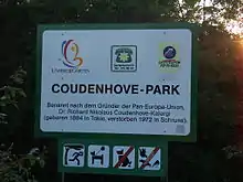 Coudenhove-Kalergi is buried at Gruben near Gstaad.[56] His grave, covered with wild grapes, is located in a Japanese rock garden in the Swiss Alps. Upon the grave is the French epitaph "Pionnier des États-Unis d'Europe" (Pioneer of the United States of Europe).[57]